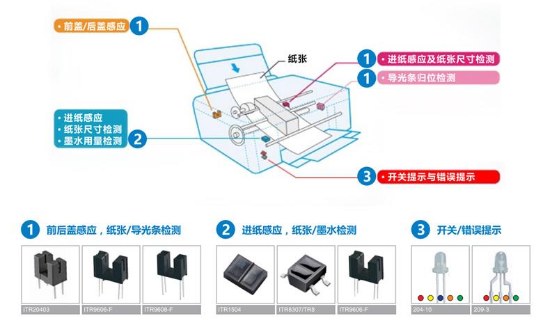 進紙感應會用到億光生產的反射式光電開關ITR8307-TR8或者億光電子紅外線ITR1204SR10A/TR,他主要起到的作用是檢測紙張尺寸以及墨水用來。